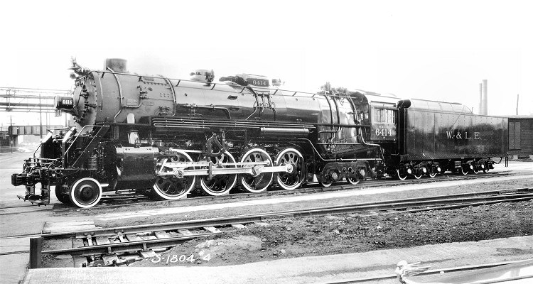 Berkshire No. 6414 of the Wheeling & Lake Erie, appearing here in a left-side ALCo builder's photo, was a member of the railroad's third group of class K-1 2-8-4s delivered in 1939. With 245 p.s.i. of boiler pressure, cylinders of 25x34 inches, and 69-inch driving wheels, these locomotives developed 64,135 pounds of tractive effort. No. 6414 and its classmates weighed 413,170 pounds. They had 4708 square feet of evaporative heating surface, 1924 square feet of superheating surface, and 90 square feet of grate area. No. 6414, which became Nickel Plate No. 814 after 1949, was sold for scrap in late 1963.