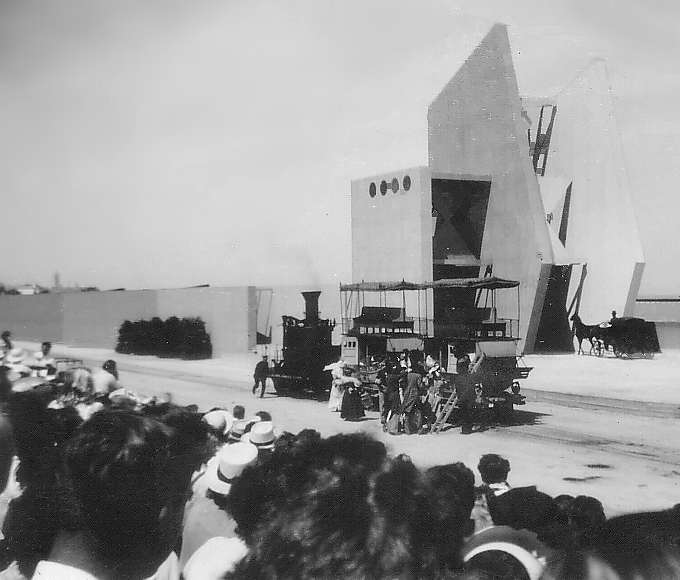 The Baltimore & Ohio's Atlantic, built in 1832 by Phineas Davis, pauses in front of the grandstand to allow passengers to enter its coaches.