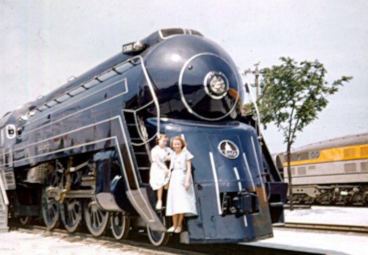 The Baltimore & Ohio streamlined several of its "President" Pacifics for service on the Cincinnatian, which operated between Baltimore and Cincinnati (after 1950, between Detroit and Cincinnati). No. 5302, the President Jefferson, was displayed at the 1948 Fair, and is shown here next to one of the Chesapeake & Ohio steam turbine electrics. Joseph Veverka photographed his wife Josephine and daughter JoAnne standing on the pilot steps, in this transparency submitted by Joe Nemec. |