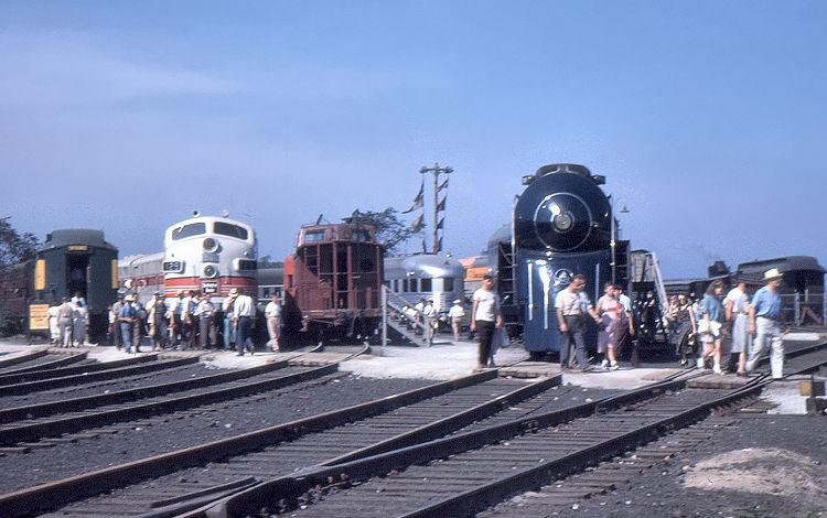 If not appearing in the pageant, locomotives and rolling stock were displayed in an exhibit area. Here, Burlington Route EMD F3 four-unit freight diesel No. 129 is at left, and one of the Baltimore & Ohio's 4-6-2 (Pacific) types streamlined for the Cincinnatian is on the right. |