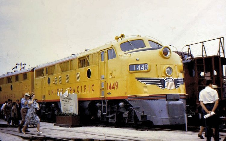 Union Pacific Electro-Motive F3A unit 1449 and a companion were fresh from delivery by the builder when displayed at the 1948 fair in July 1948. This unit was traded back to EMD in 1964 for newer power.