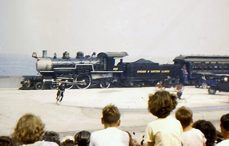 Chicago & Eastern Illinois 4-4-2 No. 222 pulls past the grandstand during the 1948 "Wheels-a-Rolling" pageant. Still on the railroad's roster in 1948, the locomotive was slightly "antiqued" for the fair by having a raised headlight installed. After the fair it was scrapped, but its running gear (cylinders, drivers and rods) was made into an operating display at the Museum of Science and Industry. (Note: In Mr. O'Connor's original transparency a light pole obscured the front of the locomotive. The image has been digitally altered to remove the pole and restore the 1948 appearance of No. 222.) |