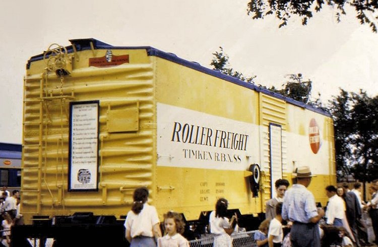 In the 1940s most railroad freight car wheels had solid journal bearings, but many newer passenger cars and locomotives were using roller bearings. At the 1948 Railroad Fair the Timken Roller Bearing Company of Canton, Ohio, exhibited a demonstration "Roller Freight" car utilizing the company's famous tapered roller bearings (not visible, however, in this transparency). Today all equipment in revenue service that is interchanged between railroads is required to have roller bearings. |