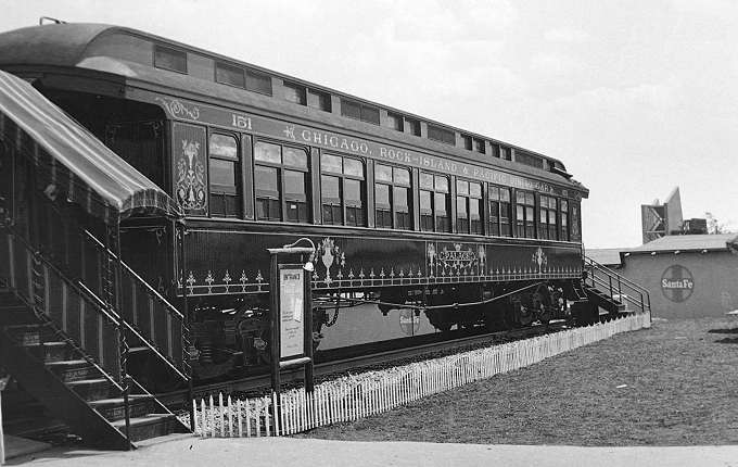 "Rocket Village," display of the Rock Island Lines, included a replica of the 1880 Palace dining car, which served old-fashioned meals.