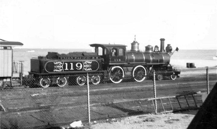Union Pacific 4-4-0 No. 119 was one of two locomotives that participated in the 1869 Golden Spike cememony at Promontory Point, Utah, marking the completion of the transcontinental railroad. The other locomotive was the Central Pacific's Jupiter. Both of these historic locomotives were scrapped, so twentieth-century reenactments of the ceremony — such as that during the "Wheels-a-Rolling" pageant — had to use other locomotives disguised as the original participants. At the 1939 New York World's Fair the stand-in for No. 119 was Chicago, Burlington & Quincy No. 35. Comparing a postcard view of No. 35 from the 1933 "Century of Progress" Exposition it appears that the same locomotive, minus the fake balloon stack, played the role of No. 119 at the Chicago Railroad Fair. |