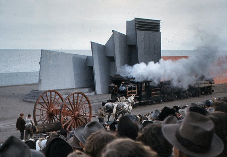 The northern Pacific's Minnetonka participates in a demonstration of nineteenth-century lumbering operations. The Minnetonka, built in 1870, was used in construction of the Northern Pacific's lines in the Pacific Northwest.