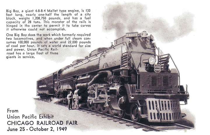 The Union Pacific issued this postcard featuring its famous "Big Boy" 4-8-8-4. Contrary to the caption, these locomotives are not Mallets (compound, using steam twice) but simple articulateds.