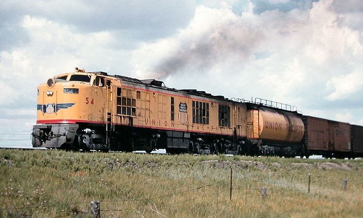 No. 54 on the hill east of Laramie, Wyoming, August 1957.©2018 Richard Leonard. This photo appears in Raimar Lehmann's bookGasturbinenlokomotiven & Gasturbinentriebwagen (2018)