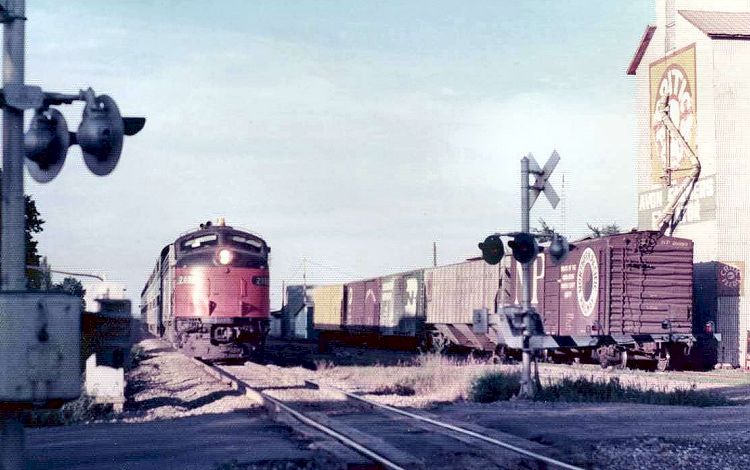 Amtrak 292, an EMD E-8A built in 1950, speeds the Illinois Zephyr northbound through Avon, Illinois on Burlington Northern trackage in June 1975. The unit was formerly Pennsylvania Railroad 5884A, then Penn Central 4284.