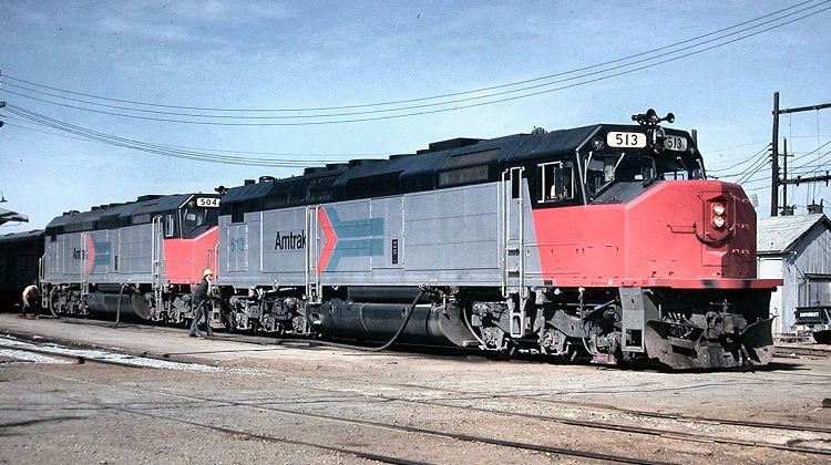 Amtrak SDP-40F units 513 and 504, in their first year of service, pause at Fort Worth depot with the Texas Chief in March 1974. Electro-Motive's SDP-40-F was the first new locomotive ordered by Amtrak, which acquired 150 units in 1973-1974. The design was based on the SD-40-2 freight locomotive but had a wider carbody, passenger gearing allowing a maximum speed of 100 m.p.h., two steam generators, and a 5000-gallon water tank for use with legacy passenger equipment.