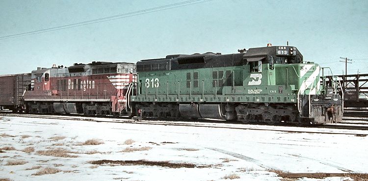 A pair of Colorado & Southern EMD SD-7 units pull through Fort Worth, Texas in February 1973. The lead unit, 813, has been repainted in Burlington Northern colors but the trailing unit, 816, still wears the Burlington Route livery three years after the BN merger. Both units, however, are sublettered for subsidiary Colorado & Southern.