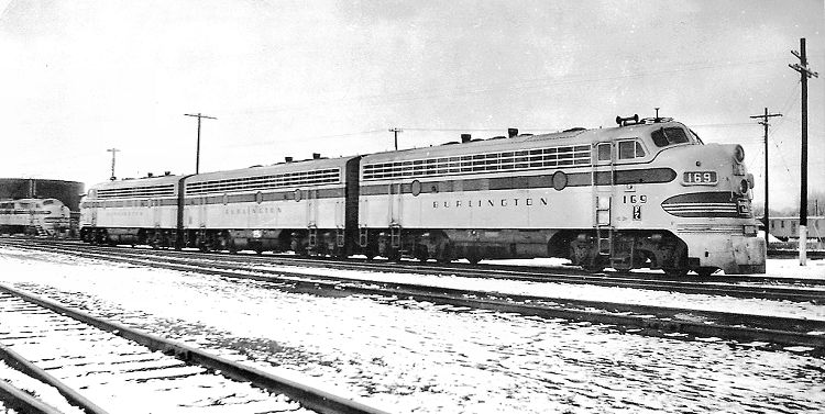 Burlington Route EMD F-7 units 169A, 169B and 165A idle in the terminal area at Galesburg, Illinois on a dingy day in late December 1956. Sources indicate they were built in 1950 and traded back to Electro-Motive in 1969.