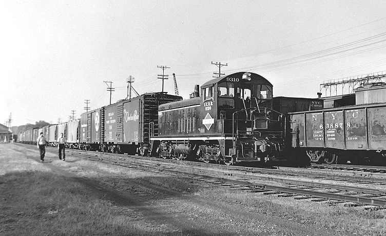 Illinois Central EMD SW-7 9310 switches the Bloomington, Illinois yard in August 1956 as two of my teenage friends stroll by. Electro-Motive Division delivered it in 1950. In 1957 it was renumbered 1210 to make room for a GP-7 unit delivered the following year, and in 1979 to Illinois Central Gulf 1420. At some point it was rebuilt into an SW14, as were others in its group, and reportedly is still in service at Richmond, California.