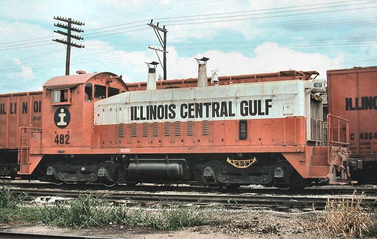 Photographed at Decatur, Illinois on September 3, 1974 is Illinois Central Gulf EMD SW-9 482. EMD delivered it in 1951 as Illinois Central 9482. In 1981 the Paducah Shops rebuilt the unit to SW14 1473; it was retired in 1996. David V. Leonard took the transparency.