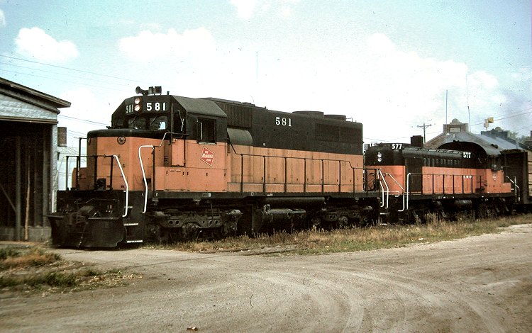 Milwaukee Road EMD SDL-39 581 and ALCo RSC-2 577 rest at Viroqua, Wisconsin in August 1974, having completed their leisurely trek over a grass-grown branch line. All examples of the SDL-39, with its short 55-foot frame, were built in 1969-1972 for the Milwaukee Road which needed a lightweight road switcher for branch line service to replace the aging RSC-2. No. 581 was wrecked and scrapped in 1983. As for the RSC-2, ALCo had constructed the Milwaukee's version of this six-axle road switcher in 1947. It is of note that the ALCo unit was originally numbered 977, then bore the number 581 (the same as the SDL-39 shown here) before being renumbered to 577. I happened to come upon this branch line freight during the transition period when both models were in use. The Milwaukee Road abandoned the Viroqua branch in 1980, but it was operated until 1981 by the Chicago, Madison & Northern Railway.