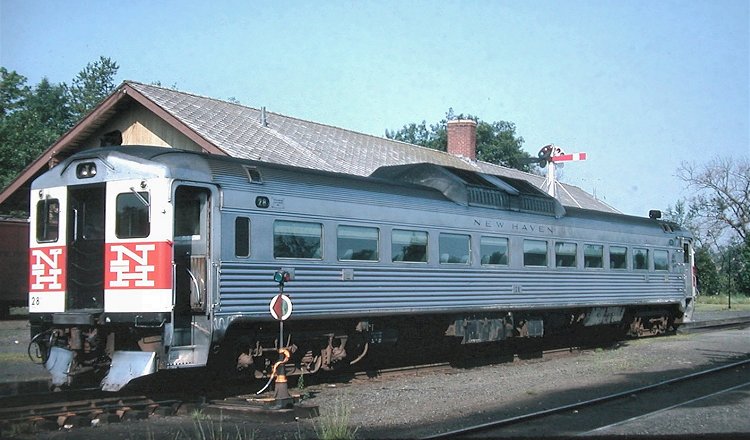 The Budd RDC-1 was powered by two 6-cylinder Detroit Diesel series 110 engines, each developing 275 horsepower. The New Haven was the second-largest operator of the RDC-1, owning 29 units; No. 28, shown here, was delivered in 1953. My father, Dr. R. D. Leonard, took this transparency at Blackstone, Massachusetts in July 1964. Reportedly the car passed into the Penn Central roster as No. 73, thence to Conrail; it was retired in 1984.