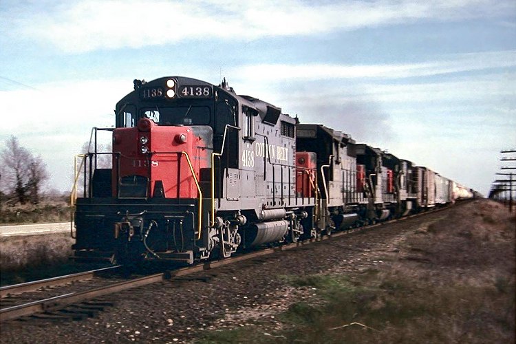EMD GP-20E unit 4138, lettered for Southern Pacific component St. Louis Southwestern (the "Cotton Belt"), leads a four-unit lashup with an eastbound SP manifest through south Texas in February 1975. Its original number was 803, but when rebuilt the unit was renumbered 4033 before assuming its final number. The "E" suffix was not an official designation but was popular railfan nomenclature to designate a unit that had been sold to subsidiary Southern Pacific Equipment Company in the R8 "Capital rebuild" program and then leased back to the railroad.