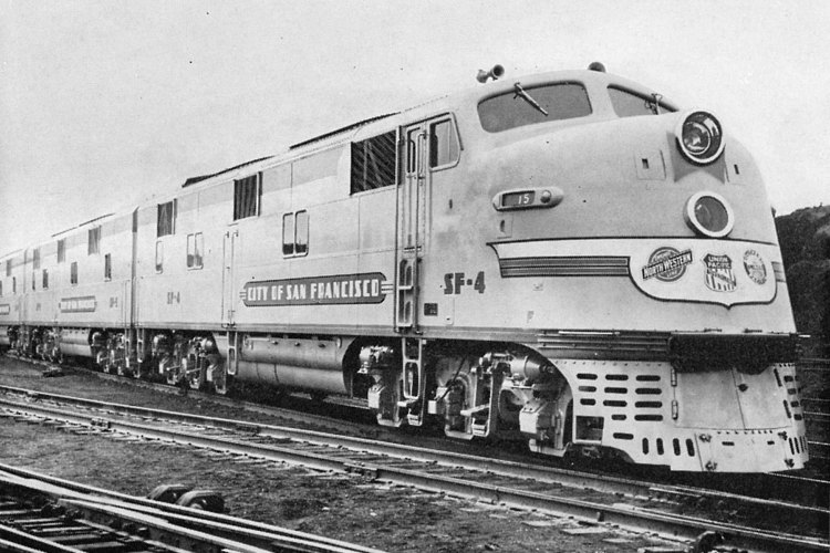 When built in 1941 for the City of San Francisco, this EMD E-6A unit numbered SF-4 was jointly owned by the three railroads participating in the premier "Overland Route" train, and bore the heralds of all three. (The trailing "B" units were SF-5 and SF-6.) In 1946 SF-4 was renumbered to 904A, and in 1948 it was renumbered to 985J (the "J" signifying joint ownership). Late in 1948 the unit was sold to the Chicago & North Western and renumbered 5004A; it was retired and scrapped in 1959. The image was scanned from A Brief History of the Chicago and North Western Line, issued by the C&NW in 1942.